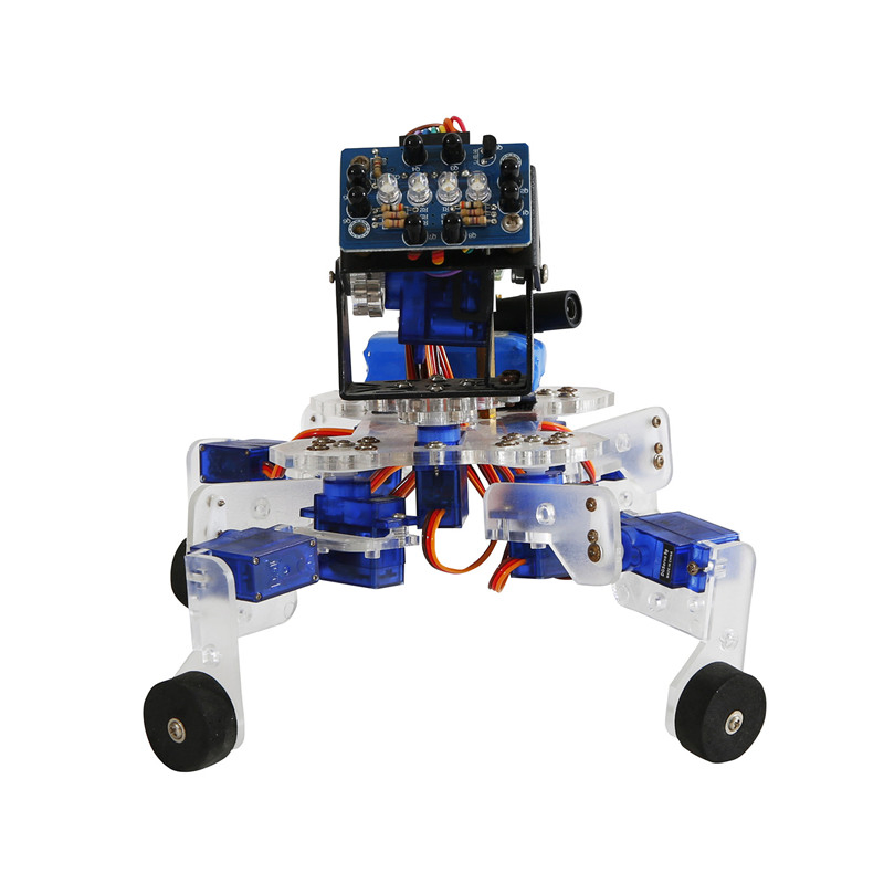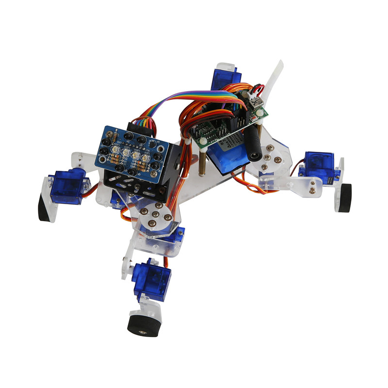Description: Introducing the Dagu ''Playful Puppy'' Quadruped Robot Kit. This kit comes with all parts except batteries. The controller comes with an ATmega8 but this is easily upgradeable if required. The sample code provided allows the puppy to sit, shake hands, lie down, beg and walk on it's hind legs. This robot is fully interactive and is controlled by hand gestures. The robot works best with a 7.4V 2300mAH battery but it can also work with 6x NiMh AA batteries in a 3x2 battery holder.